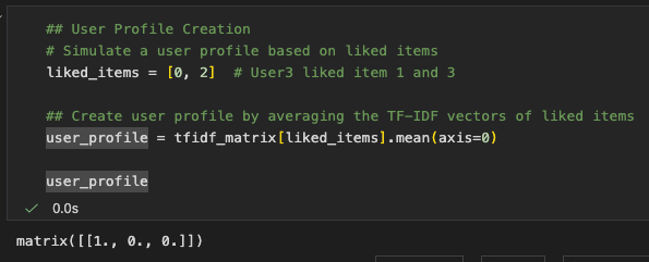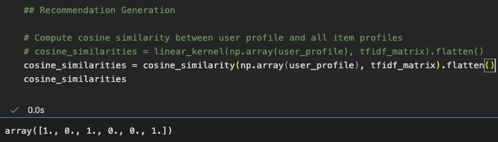 - Recommended items similar to those the user liked using cosine similarity